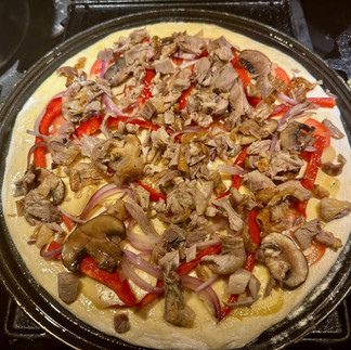 Gently brush the prepared pizza dough with olive oil, distribute the Roma tomatoes evenly, and then add the cheese as shown in the photo. Next, spread the veggies uniformly over the pie and top with the Duck and a sprinkle of salt & pepper. Bake for 10 minutes or until the edges are lightly browned.