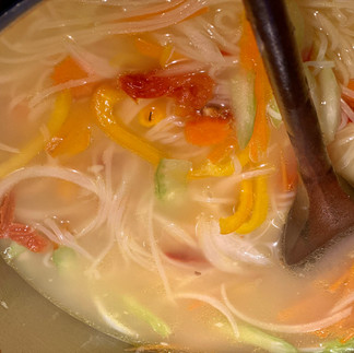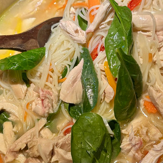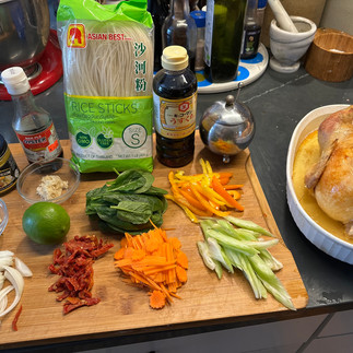 In the early nineties at Mike's on the Ave. in New Orleans, I worked with a talented Vietnamese pastry chef named Minh. For family meals, she would often whip up a quick Pho that everyone adored, and I still create variations of it today. In this recipe, I'm using roast chicken, but almost any protein can work well. The vegetables can also vary, with options like mung bean sprouts, mushrooms, cabbage, broccoli, bok choy, and baby corn. Garnishes such as mint and basil are excellent additions too.