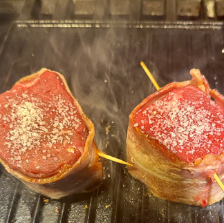 Generously season the filets with salt and pepper, then wrap each one in bacon and secure it with a skewer as shown in the photo.