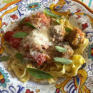 This summer pasta is ideal with or without meatballs. The zucchini sauce is light yet full of flavor, made with fresh, vibrant zucchini and either imported cherry tomatoes in sauce or fresh ones. I'm using my homemade fettuccine, but any pasta you prefer would be delicious.