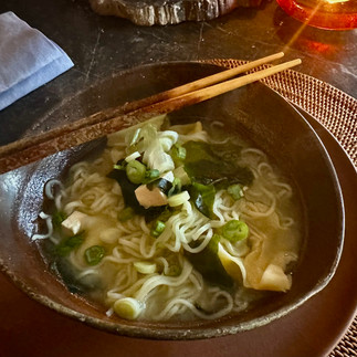 There's nothing quite as comforting, warming, or nutritious as a steaming bowl of Miso Soup. We make Miso soup with a variety of ingredients that change with the seasons, using the freshest produce available. In this classic version, we're using Koji Cook's recipe for wontons (see Koji's recipe for details). The soup is just as delicious without the wontons, but try it with them if you have the time to make them. We are adding dry Asian noodles, as shown, but any shape of pasta or noodle will work. The seaweed Wakame is wonderful; a little goes a long way, like ribbons of spinach from the sea.